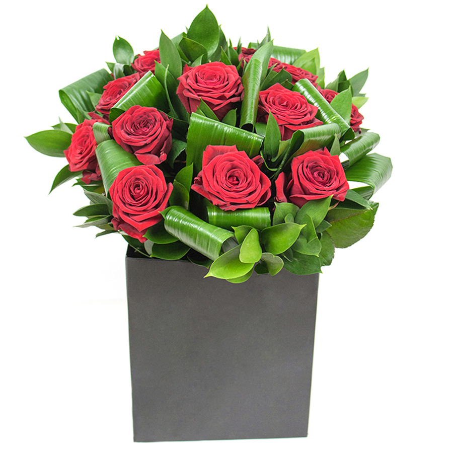 Indulge in an exquisite bouquet that weaves together passionate red roses with elegant aspidistra leaves and ruscus. This arrangement is a perfect blend of artistry and nature’s beauty.