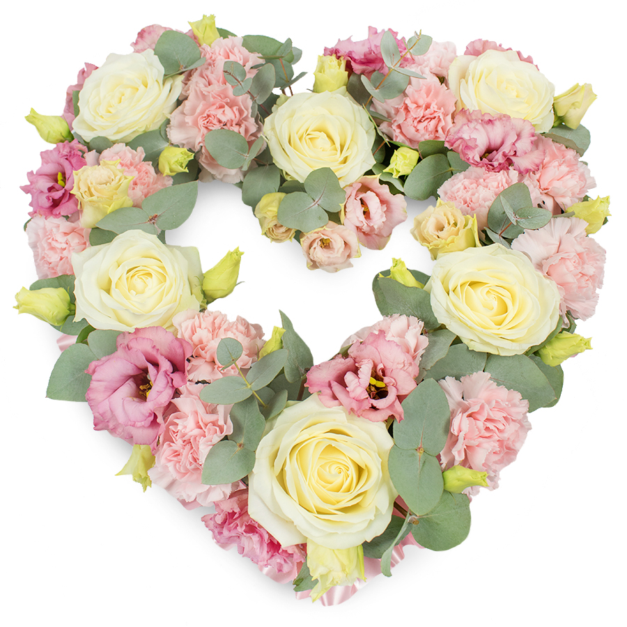 Express your heartfelt emotions with this beautiful and unique flower arrangement. Featuring a stunning mix of white roses, delicate pink carnations, elegant pink lisianthus, and fresh eucalyptus, this bouquet is a perfect symbol of love and remembrance.